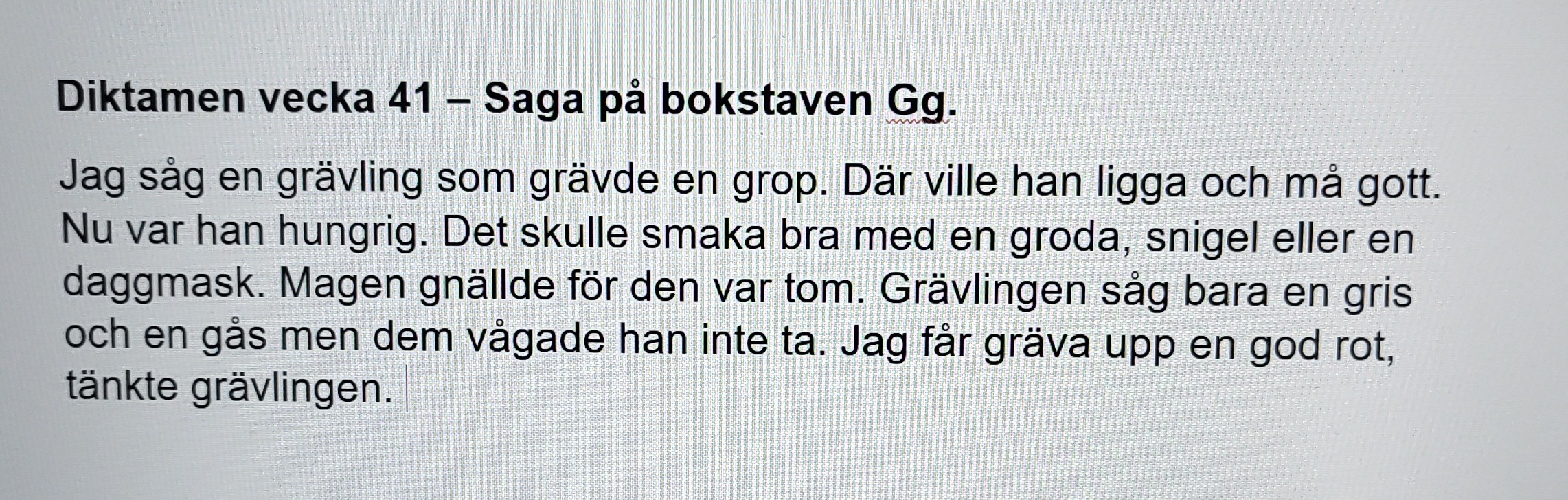 Diktamen till nästa vecka är en bokstavssaga (Gg) och några extra ord.